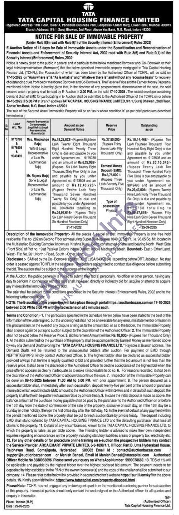 Description of the Immovable Property All the pieces & parcel of that Immovable Property is one thee holid residental Fiat no. 202 on Second Floor admeaturing Super Built-uparsa 1040:00 Sq Ft. in 9665 Sq. Mt. located in the Multistoried Building Complex known as Yitshna Kunj. Being constructed on the land bearing North West Side (Front Side of Plat no. 18 at Paisikar Colony Indore District: Indore Madhya Pradesh Bounded-East Omer Land West Flat No. 201, North: Roat, South: Other Land