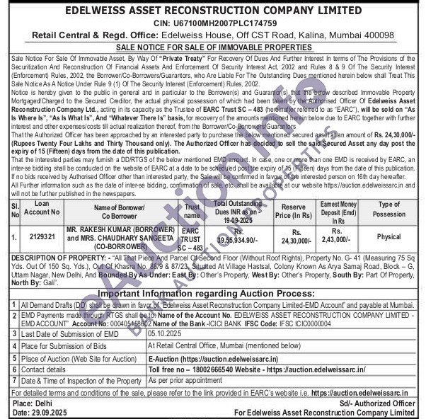 DESCRIPTION OF PROPERTY: "All That Piece And Parcel Of Second Floor (Without Roof Rights), Property No. G-41 (Measuring 75 Sq Yds. Out Of 150 Sq. Yds.), Out Of Khasra No. 88/9 & 87/23, Situated At Village Hastsal, Colony Known As Arya Samaj Road, Block - G, Uttam Nagar, New Delhi, And Bounded By As Under: East By: Other's Property, West By: Other's Property, South By: Part Of Property, North By: Gall