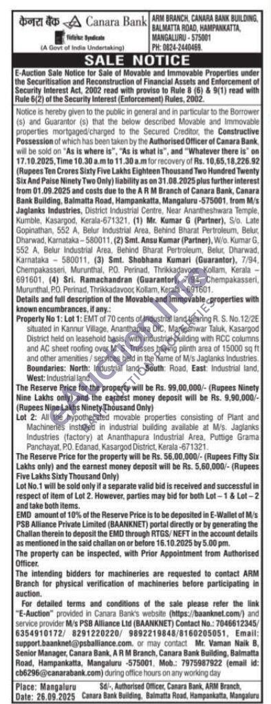 Lot 2: All the hypothecated movable properties consisting of Plant and Machineries installed in industrial building available at M's. Jaglaniks Industries (factory) at Ananthapura Industrial Area, Puttige Grama Panchayat, PO. Edanad, Kasargod District, Kerala -671321.