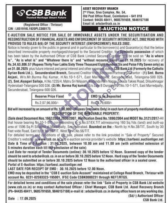 All that house bearing No.10-1-571 corresponding to H.No.57/EX.TIT admeasuring 160 Sq. Yds (land) and built-up area of 1596 Sq.Ft Situated at Maredpally, Secunderabad. Bounded on the North by H.No.38/TIT, South by 30 Feet wide Road, East by H No.58/TIT, West by H.No.56/TIT.