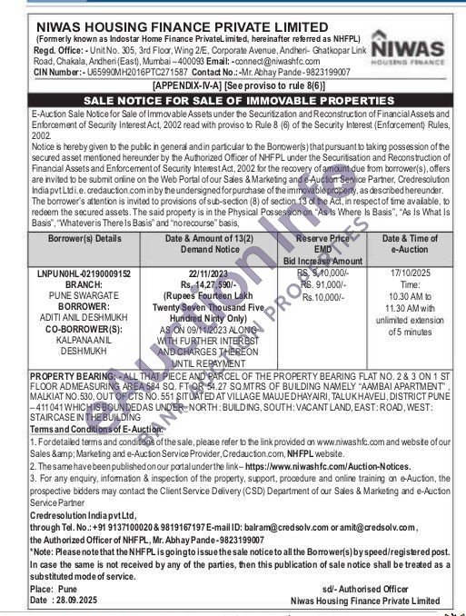 ALL THAT PIECE AND PARCEL OF THE PROPERTY BEARING FLAT NO. 2 & 3 ON 1 ST FLOOR ADMEASURING AREA 584 SQ. FT OR 54.27 SQ.MTRS OF BUILDING NAMELY "AAMBAI APARTMENT". MALKIAT NO.530, OUT OF CTS NO. 551 SITUATED AT VILLAGE MAJEDHAYAIRI, TALUKHAVELI, DISTRICT PUNE -411041 WHICH IS BOUNDEDAS UNDER NORTH: BUILDING, SOUTH: VACANT LAND, EAST: ROAD, WEST: STAIRCASE IN THE BUILDING