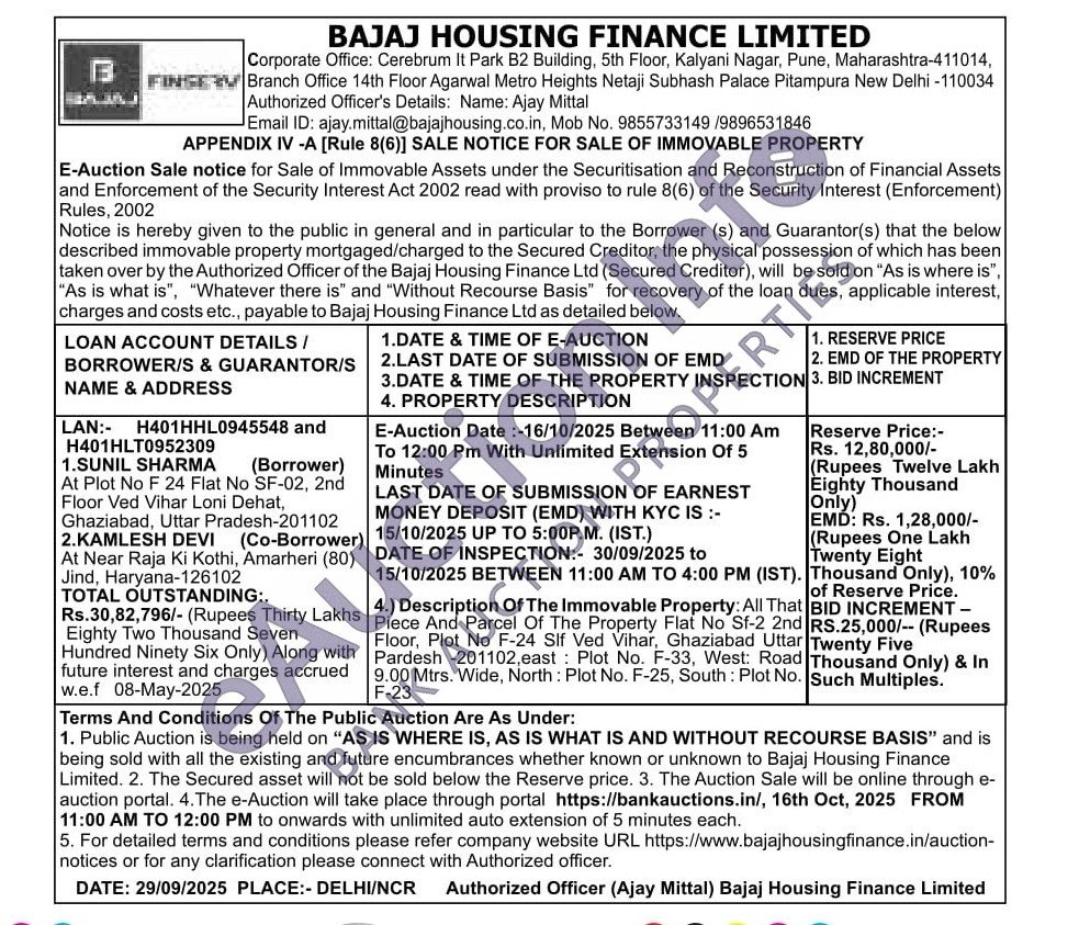 Description Of The Immovable Property: All That Piece And Parcel Of The Property Flat No Sf-2 2nd Floor, Plot No F-24 Slf Ved Vihar, Ghaziabad Uttar Pardesh -201102,east: Plot No. F-33, West: Road 9.00 Mtrs. Wide, North: Plot No. F-25, South: Plot No. F-23