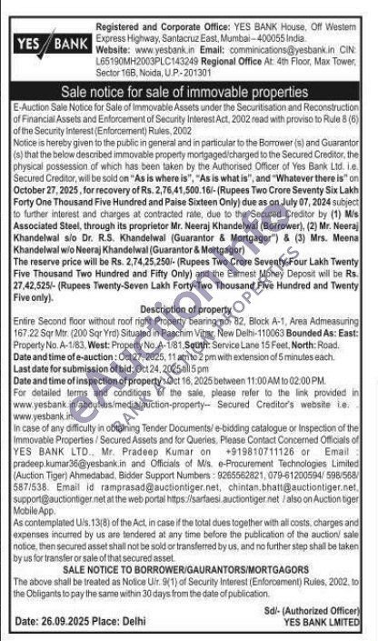 Entire Second floor without roof right Property bearing no. 82, Block A-1, Area Admeasuring 167.22 Sqr Mtr (200 Sqr Yrd) Situated in Paschim Vihar, New Delhi-110063 Bounded As: East: Property No. A-1/83, West: Property No.A-1/81, South: Service Lane 15 Feet, North: Road.