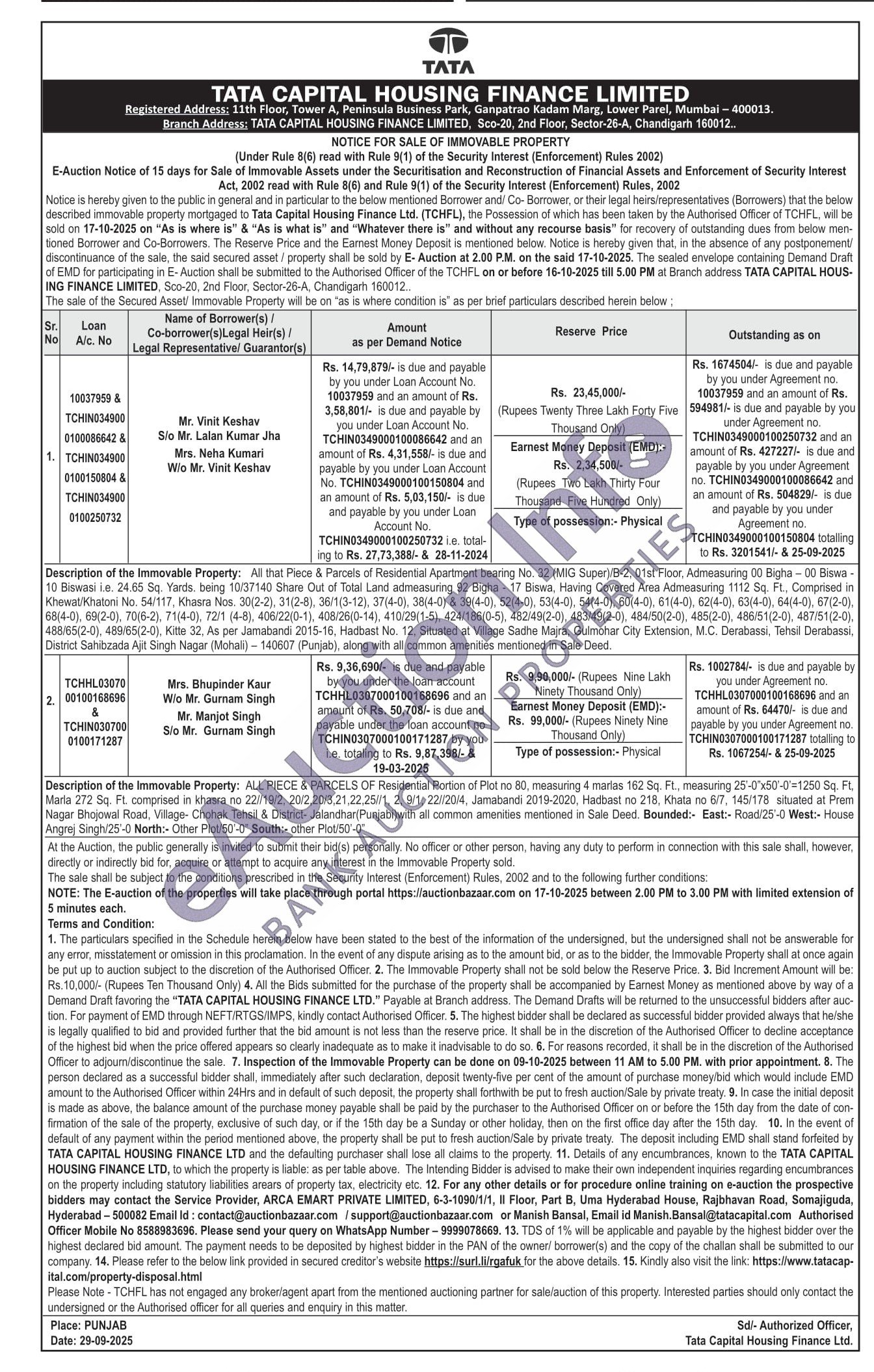 Description of the Immovable Property: ALL PIECE & PARCELS OF Residential Portion of Plot no 80, measuring 4 marlas 162 Sq. FL, measuring 25-0x50-0-1250 Sq. FL. Marta 272 Sq. Ft. comprised in khasra no 221/19/2, 20/2-20/3.21.22.25//1, 2, 0/1, 22/204, Jamaband 2019-2020, Hadbast no 218, Khata no 6/7, 145/178 situated at Prem Nagar Bhojowal Road. Village- Chohak Tehsil & District-Jalandhar Punjabi with all common amenities mentioned in Sale Deed. Bounded:- East:-Road/25-0 West:- House Angrej Singh 25-0 North:- Other Plot/50-0" South: other Plot/50-0