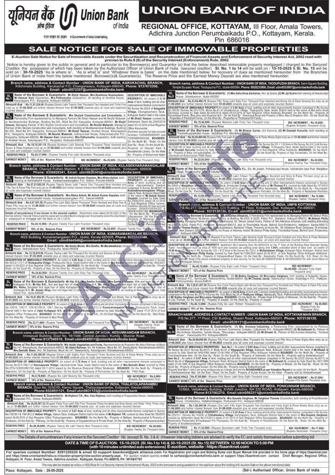 9) An extent of 2.60 Ares of land, building and all other improvements thereon comprised in Ra Survey No. 165/20 (Survey No. 351/1/19), Block No.41 of Udumbannoor Village, Thodupuzha Talus, Idukki District held in the name of Mrs Asha Anna Zacharias covered by Sale Deed No.625/2016 dated 09-03-2016 of Sub Registrar Office Kankodu Bounded. On the North By: Property of Panachikkal Family, Bana Alex and Shajimon M.K. On the East By Panchayat Road and Property of Binu Alex & Shajimon MK. On the South By Properties of Parachaill Family, On the West By: Properties of Thottiparambil Family