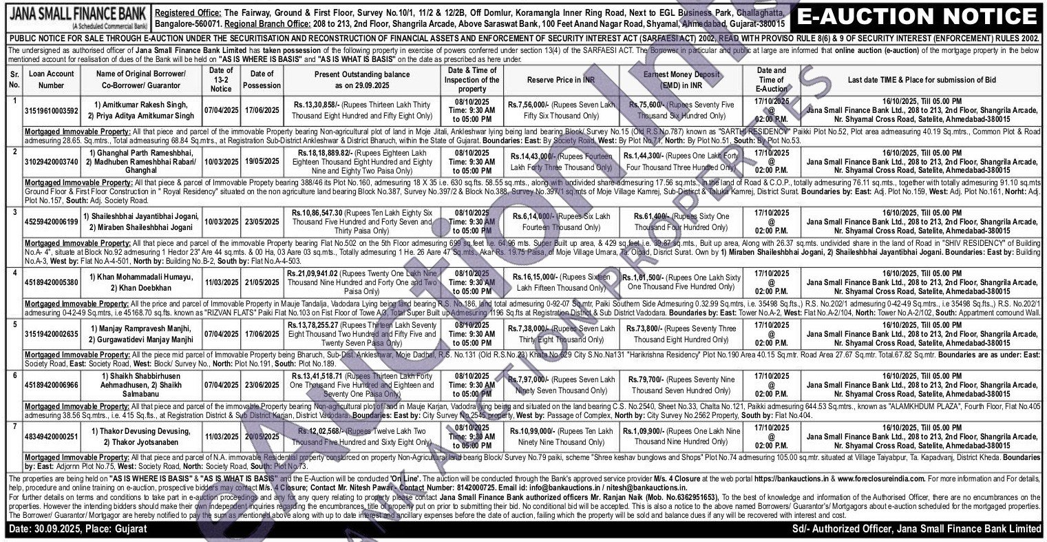 Mortgaged Immovable Property: All that piece and parcel of the immovable Property bearing Non-agricultural plot of land in Moje Jital vas lying being land bearing Block! Survey No.15 (Old RS.No. 787) known as "SARTHI RESIDENCY Paliki Plot No 52, Pict area admeasuring 40.19 Sq.mins, Common Plot & Road admesuring 28.65. Sq.mirs Total admeasuring 68.84 Sqmtes, al Registration is, al Registraton Sub-Distict Arkleshwar & District Bharuch within the State of Gujarat. Boundaries: East: By Society Road 1. By Society Road West: By Plot No.71, North: By Plot No.51, South: By Plot No.53.
