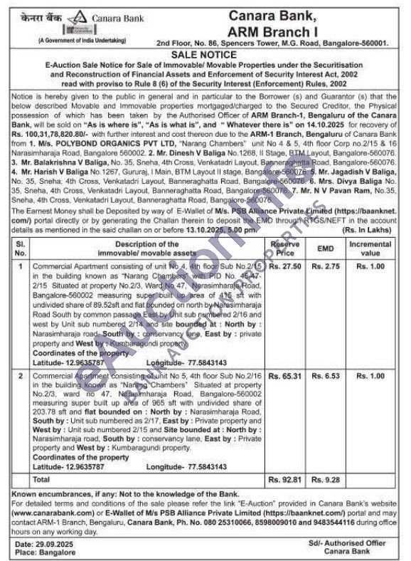 Commercial Apartment consisting of unit No 5, 4th floor Sub No 2/16 in the building known as "Narang Chambers Situated at property No.2/3, ward no 47. Narasimharaja Road, Bangalore-560002 measuring super built up area of 965 sft with undivided share of 203.78 sft and flat bounded on: North by Narasimharaja Road, South by: Unit sub numbered as 2/17, East by: Private property and West by: Unit sub numbered 2/15 and Site bounded at: North by: Narasimharaja road, South by conservancy lane, East by: Private property and West by: Kumbaragundi property. Coordinates of the property