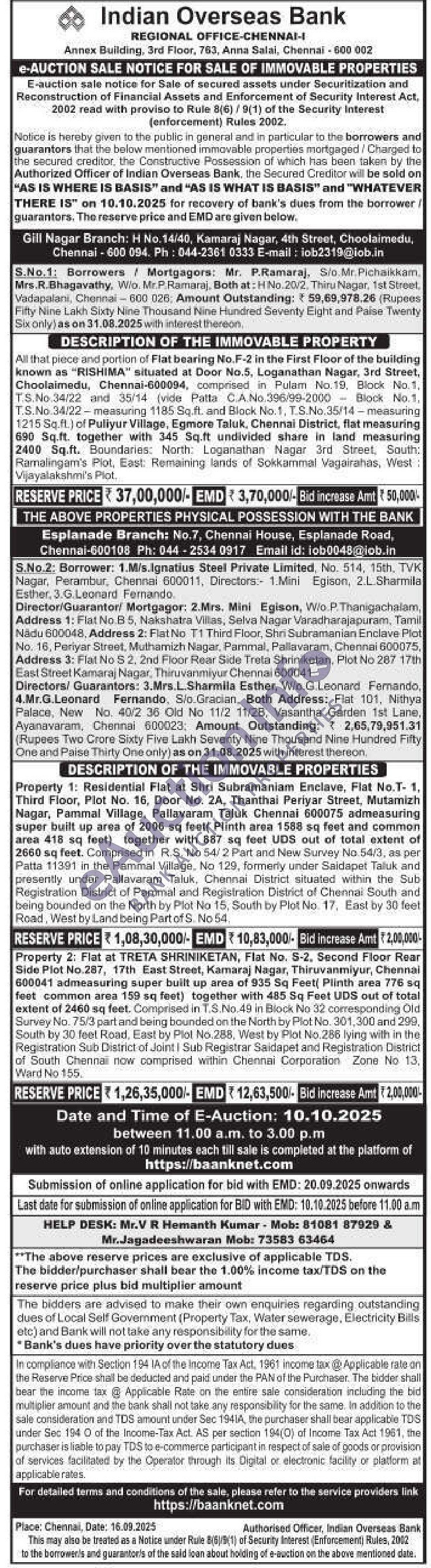 Third Floor, Plot No. 16, Door No. 2A, Thanthai Periyar Street, Mutamizh Nagar, Pammal Village, Pallavaram Taluk Chennai 600075 admeasuring super built up area of 2006 sq feet(Plinth area 1588 sq feet and common area 418 sq feet) together with 887 sq feet UDS out of total extent of 2660 sq feet. Comprised in R.S. No 54/2 Part and New Survey No.54/3, as per Patta 11391 in the Pammal Village, No 129, formerly under Saidapet Talluk and presently under Pallavaram Taluk, Chennai District situated within the Sub Registration District of Pammal and Registration District of Chennai South and being bounded on the North by Plot No 15, South by Plot No. 17, East by 30 feet Road, West by Land being Part of S. No 54