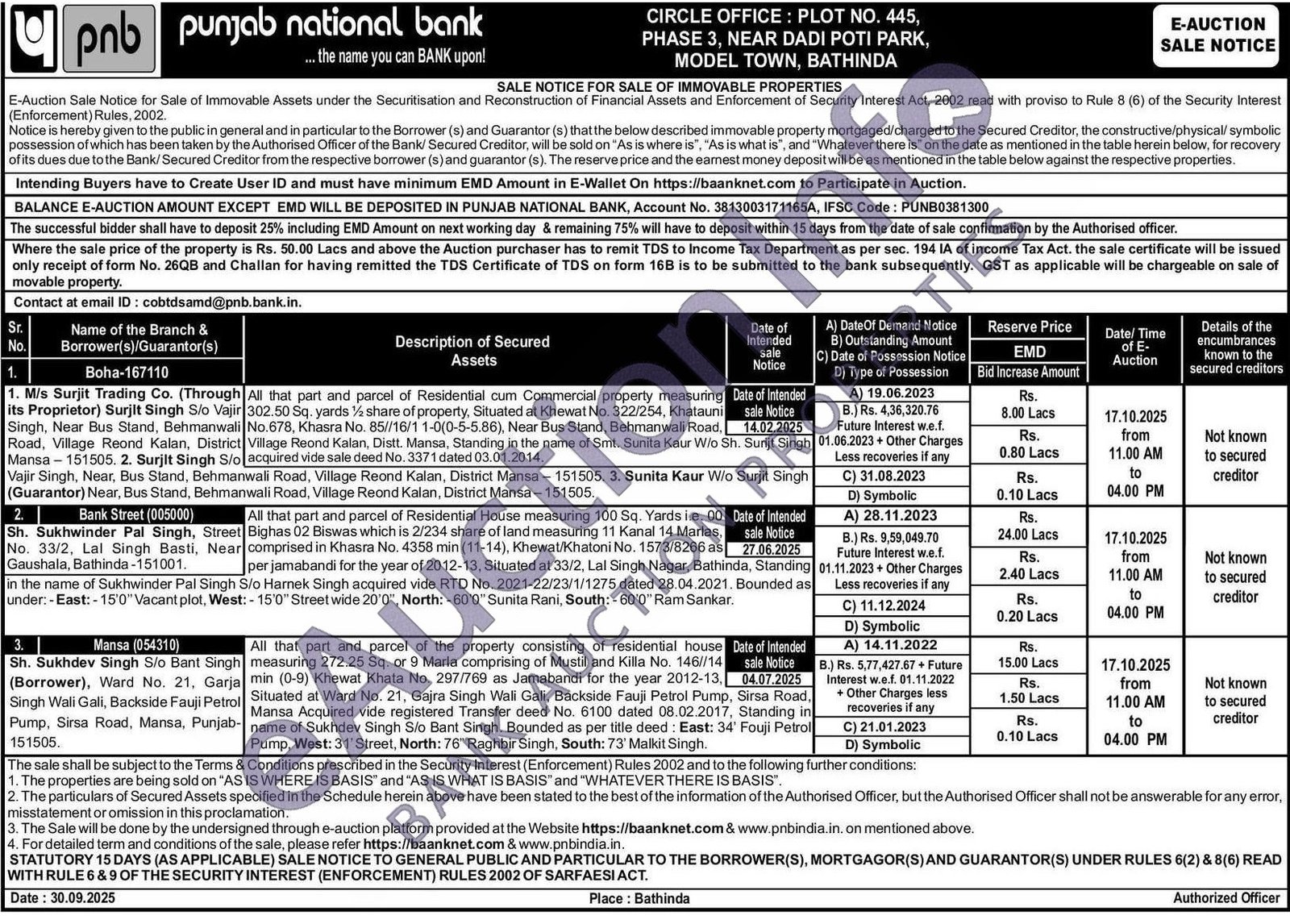 All that part and parcel of Residential House measuring 100 Sq. Yards i.e. 00 Bighas 02 Biswas which is 2/234 share of land measuring 11 Kanal 14 Marlas, comprised in Khasra No. 4358 min (11-14), Khewat/Khatoni No. 1573/8266 as per jamabandi for the year of 2012-13, Situated at 33/2, Lal Singh Nagar, Bathinda, Standing S/o Harnek Singh acquired vide RTD No. 2021-22/23/1/1275 dated 28.04.2021. Bounded as : - 15'0" Street wide 20'0", North: - 60'0" Sunita Rani, South: - 60'0" Ram Sankar.