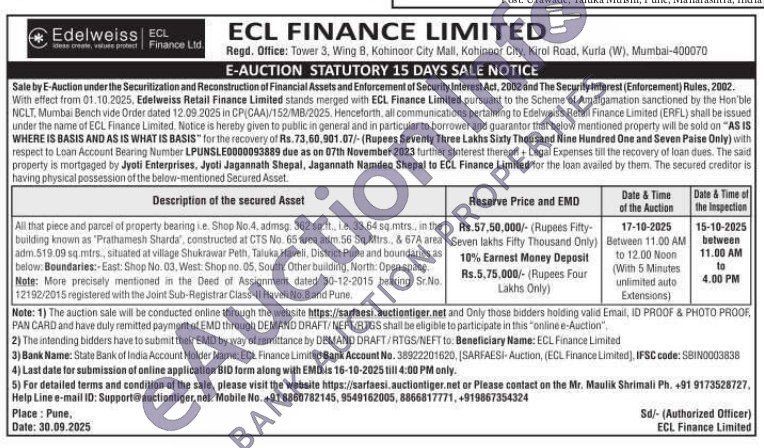 All that piece and parcel of property bearing ie. Shop No.4, admsg. 362 sq.ft., ie. 33.64 sq.mtrs, in the building known as "Prathamesh Sharda', constructed at CTS No. 65 area adm.56 Sq.Mtrs., & 67A area adm 519.09 sq.mtrs, situated at village Shukrawar Peth, Taluka Haveli. District Pune and boundaries as below: Boundaries:-East: Shop No. 03, West: Shop no. 05, South. Other building, North: Open space. Note: More precisely mentioned in the Deed of Assignment dated 30-12-2015 bearing Sr.No. 12192/2015 registered with the Joint Sub-Registrar Class-II Haveli No.Band Pune.
