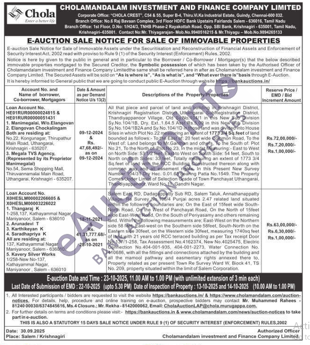 Salem East RD, Dadagappatty Sub RD, Salem Taluk, Annathanappatty Village, Re Survey No. 106/4 Punjai acres 2.47 related land situated within the following boundaries are: On the East of 15feet wide South-North Road. On the West of Panchayat Road, On the North of 15feet wide East-West Road, On the South of Periyasamy and others remaining land. Within the following measurements are: East-West on the Northerm side 58 feet, East-west on the Southem side 58feet, South-North on the Eastern side 30feet, on the Western side 30feet, measuring 1740sq foot of land with 21 years old RCC terraced building as per Tax receipt Door No. 137/1-258, Tax Assessment No.4162374, New No.4025475, Electric Connection No.404-001-935, 404-001-2273. Water Connection No. 410686, with all the fittings and connections attached by the building and all the mamool pathway and easmentary rights annexed there to, Property related as per present Town Re Survey Ward W. Biock 41, TS No. 209, property situated within the limit of Salem Corporation.
