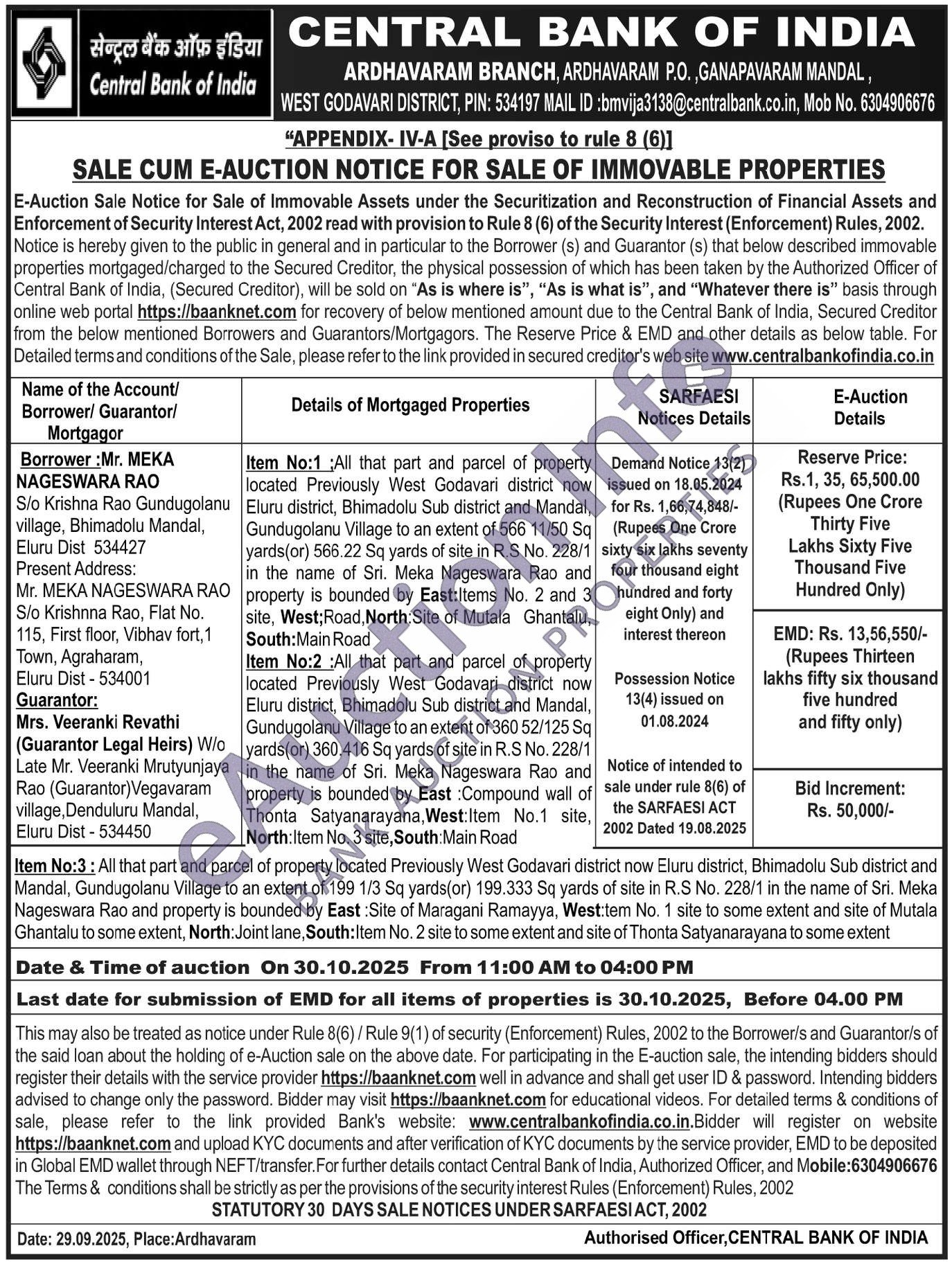 Item No:1 ;All that part and parcel of property located Previously West Godavari district now Eluru district, Bhimadolu Sub district and Mandal, Gundugolanu Village to an extent of 566 11/50 Sq yards(or) 566.22 Sq yards of site in R.S No. 228/1 in the name of Sri. Meka Nageswara Rao and property is bounded by East:Items No. 2 and 3 site, West; Road, North: Site of Mutala Ghantalu, South: Main Road