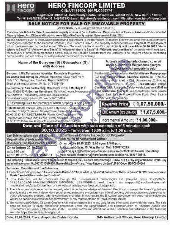 Residential Property situated at Marittickal House, Manapppuram P.O Sree Narayana Road, Cherthala 688526, Re Sy No.46/2 (Admeasuring 01.21 Ares), 46/3-2 (Admeasuring 25.49 Ares), 463-1, (Admeasuring 00.81 Ares), Thaikkattusseri Village, Cherthala Taluk, Alappuzha District Kerala. Land area 29589 sq ft and built up area-1350 sq ft. Bounded as follows North: Balance Property, East Balance Property Private Road West Balance Property, South Mr. Smith Shaj