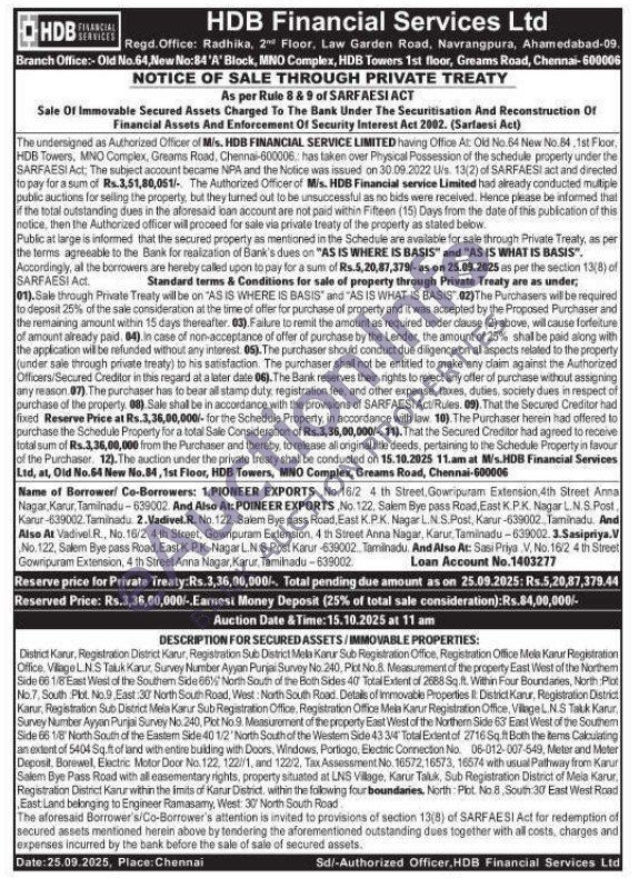 District Karur, Registration District Karur, Registration Sub District Mela Karur Sub Registration Office, Registration Office Mela Karur Registration Office Village LNS Taluk Karur, Survey Number Ayyan Punjai Survey No. 240, Pict No. 8. Measurement of the property East West of the Northem Side 66 1/8 East West of the Southem Side 66% North South of the Both Sides 40 Total Extent of 2688 Sq.ft. Within Four Boundaries, North Plot No.7, South Plot. No.9, East 30 North South Road, West: North South Road. Details of Immovable Properties Il District Kanur, Registration District Karur. Registration Sub District Mela Karur Sub Registration Office, Registration Office Mela Karur Registration Office, Village L.NS Taluk Karur Survey Number Ayyan Purijai Survey No.240, Plot No.9. Measurement of the property East West of the Northern Side 63 East West of the Southem Side 66 1/8" North South of the Eastem Side 40 1/2' North South of the Westen Side 43 344 Total Extent of 2716 Sq.ft Both the items Calculating an extent of 5404 Sq.ft of land with entire building with Doors, Windows, Portiogo, Electric Connection No. 06-012-007-549, Meter and Meter Deposit, Borewel, Electric Motor Door No. 122, 122//1, and 122/2. Tax Assessment No. 16572, 16573, 16574 with usual Pathway from Karur Salem Bye Pass Road with all easementary rights, property situated at LNS Village, Karur Taluk, Sub Registration District of Mela Karur, Registration District Karur within the Imits of Karur District, within the following four boundaries. North: Plot No 8, South 30 East West Road East Land belonging to Engineer Ramasamy, West: 30 North South Road