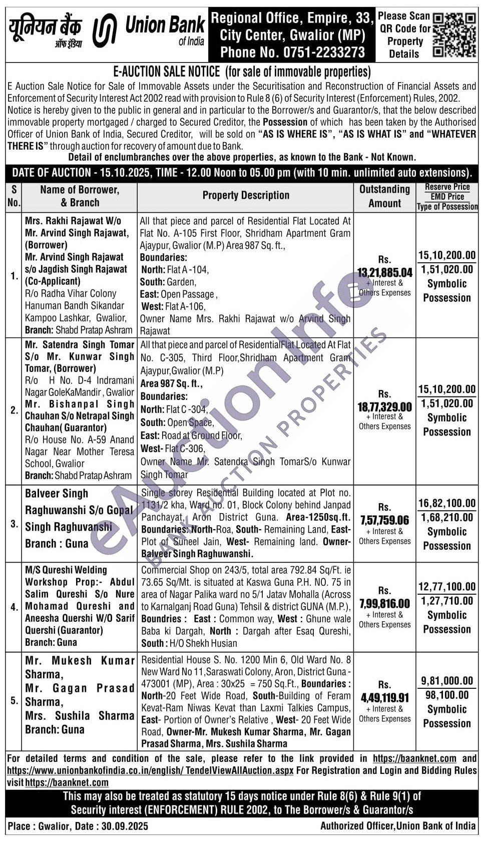 All that piece and parcel of Residential Flat Located At Flat No. A-105 First Floor, Shridham Apartment Gram Ajaypur, Gwalior (M.P) Area 987 Sq. ft., Boundaries: North: Flat A-104, South: Garden, East: Open Passage, West: Flat A-106, Owner Name Mrs. Rakhi Rajawat w/o Arvind Singh Rajawat
