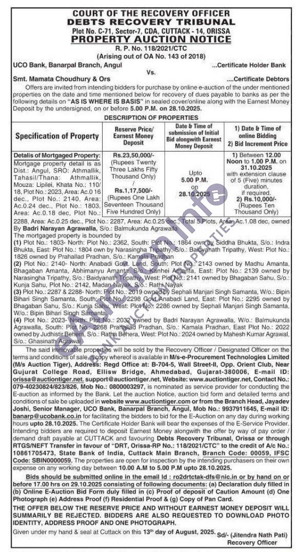 Detalis of Mortgaged Property Mortgage property detail is as Dist.: Angul, SRO: Athmallik, Tahasil/Thana: Athmallik, Mouza: Lipilei, Khata No.: 110/18, Plot No.: 2023, Area: Ac.0 16 dec., Plot No.: 2140, Area: Ac.0.24 dec., Plot No.: 1803, Area: Ac.0.18 dec, Plot No. 2288, Area: Ac.0.25 dec., Plot No.: 2287, Area: Ac. 0.25 dec., Total 5 Plots, Area: Ac. 1.08 dec, owned By Badri Narayan Agrawalla, S/o.: Balmukunda Agrawalla