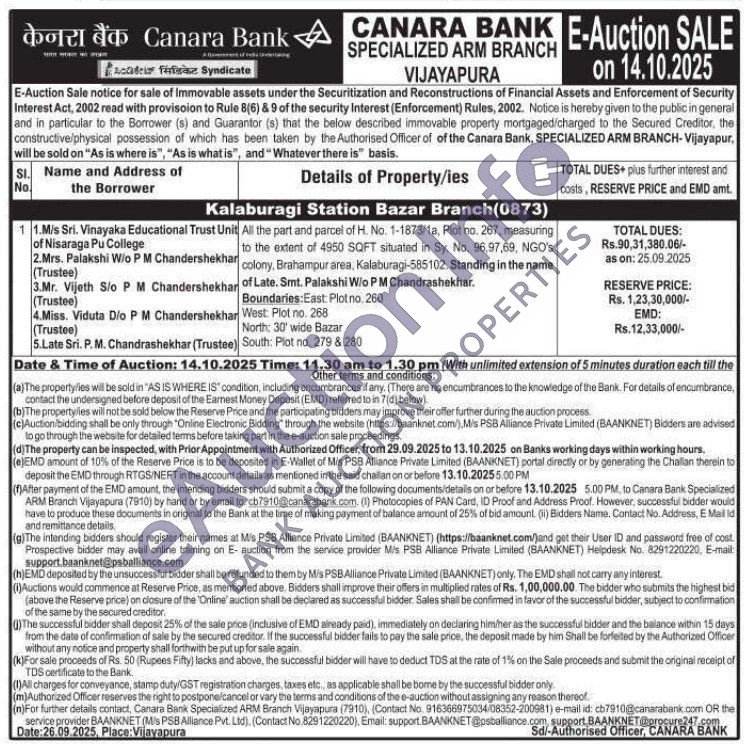 All the part and parcel of H. No. 1-1873/1a, Plot no. 267, measuring to the extent of 4950 SQFT situated in Sy. No. 96,97,69, NGO's colony, Brahampur area, Kalaburagi-585102. Standing in the nameLate. Smt. Palakshi W/o PM Chandrashekhar. Boundaries: East: Plot no. 260 West: Plot no. 268North: 30' wide BazarSouth: Plot no. 279 & 280
