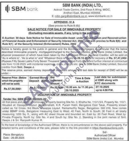 All that piece and parcel of immovable Property bearing Site No. 3. Khatha No. 110/1/3/4, Property No. 110/1. Situated at: Dasappa Layout, Kowdenahalli, K.R. Puram Hobli, Bangalore East Taluk, Presently known called as 1st Cross. 3rd Block, Dasappa Layout, Ramamurthy Nagar, Bangalore- 560 016, Now comes under BBMP limits, Bangalore measuring East to West: 40 Feet, North to South: 30 Feet in all totally measuring 1200 Sq. ft., along with AC sheet House and bounded on: East by: 20 Feet Road, West by: Private Property, North by: Site No. 4 and South by: Site No. 2. Standing in the joint names of Smt. Deepa J & Sri. Ranjeeth Kumar R.