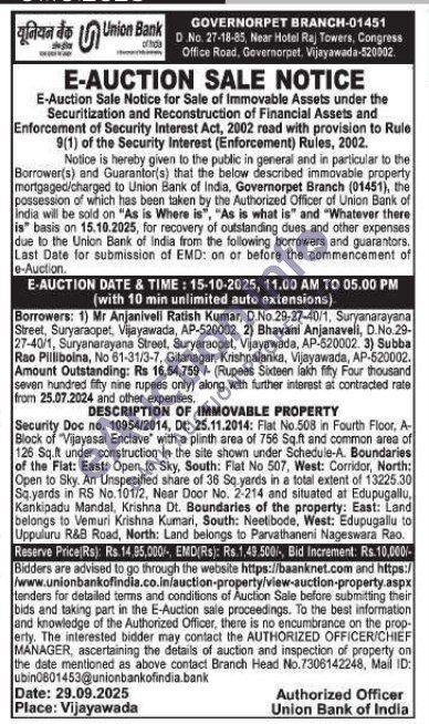 Security Doc no. 10954/2014, Dt: 25.11.2014: Flat No.508 in Fourth Floor, A-Block of "Vijayasai Enclave with a plinth area of 756 Sq.ft and common area of 126 Sq.ft under construction in the site shown under Schedule-A. Boundaries of the Flat: East: Open to Sky, South: Flat No 507, West: Corridor, North: Open to Sky. An Unspecified share of 36 Sq yards in a total extent of 13225.30 Sq.yards in RS No. 101/2, Near Door No. 2-214 and situated at Edupugallu, Kankipadu Mandal, Krishna Dt. Boundaries of the property: East: Land belongs to Vemuri Krishna Kumari, South: Neelibode, West: Edupugallu to Uppuluru R&B Road, North: Land belongs to Parvathaneni Nageswara Rao.