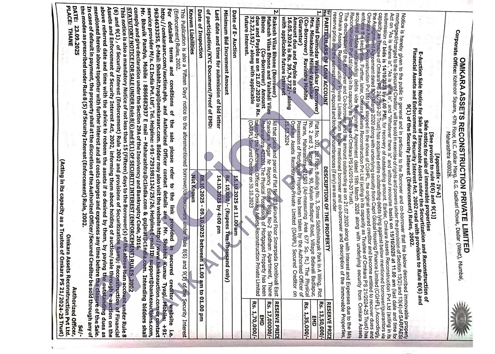Flat No. 101, 1st Floor, Building No. 3, Shree Siddhivinayak Park in A Wing, Plot No. 2 and 3, Servey No. 90, Kalyan Badlapur Road, Village Belavali Badlapur, Thane, Maharashtra-421503 (Ad-measuring Area 677 Sq. Ft.) The Physical Possession of Mortgaged Property has been taken by the Authorised Officer of Omkara Assets Reconstruction Private Limited (OARPL) Secured Creditor on 15.03.2024