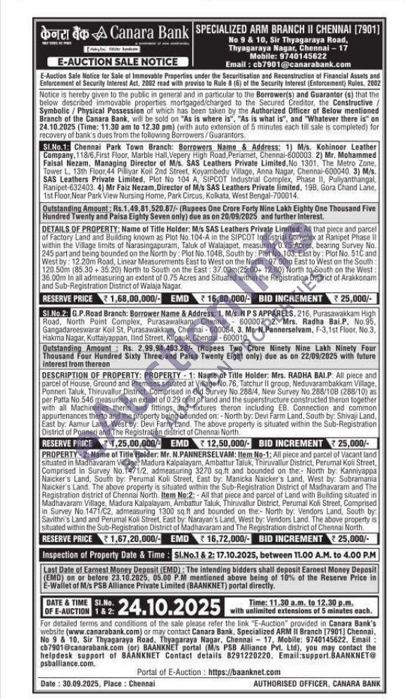 PROPERTY-2: Name of Title Holder: Mr. N.PANNERSELVAM: Item No-1: All piece and parcel of Vacant land situated in Madhavaram Village, Madura Kalpalayam, Ambattur Taluk, Thiruvallur District, Perumal Koli Street, Comprised in Survey No.1471/2, admeasuring 3270 sq.ft and bounded on the North by: Kanniyappa Naicker's Land, South by: Perumal Koli Street, East by: Manicka Naicker's Land, West by: Subramania Naicker's Land. The above property is situated within the Sub-Registration District of Madhavaram and The Registration district of Chennal North. Item No:2:- All that piece and parcel of Land with Building situated in Madhavaram Village, Madura Kalpalayam, Ambattur Taluk, Thiruvallur District, Perumal Koli Street, Comprised in Survey No. 1471/C2, admeasuring 1300 sq.ft and bounded on the North by: Vendors Land, South by: Savithri's Land and Perumal Koli Street, East by: Narayan's Land, West by: Vendors Land. The above property is situated within the Sub-Registration District of Madhavaram and The Registration district of Chennai North.