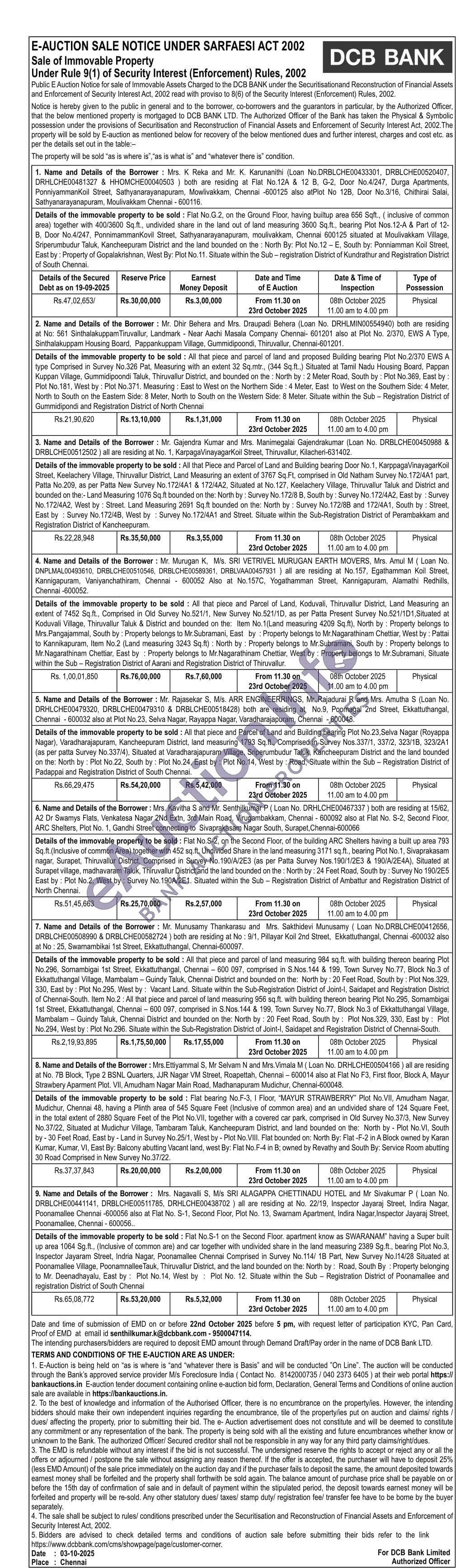 Details of the immovable property to be sold: All that piece and Parcel of Land and Building bearing Plot No.23, Selva Nagar (Royappa Nagar), Varadharajapuram, Kancheepuram District, land measuring 1793 Sq.ft., Comprised in Survey Nos.337/1, 337/2, 323/1B, 323/2A1 (as per patta Survey No.337/4), Situated at Varadharajapuram Village, Sriperumbudur Taluk, Kancheepuram District and the land bounded on the: North by: Plot No.22, South by: Plot No.24, East by: Plot No.14, West by: Road, Situate within the Sub-Registration District of Padappai and Registration District of South Chennai
