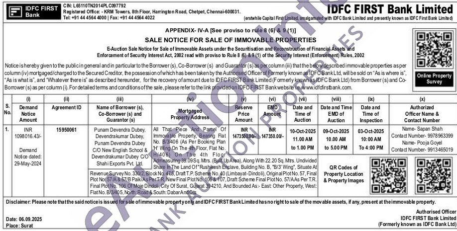 All That Piece And Parcel Of Immovable Property Bearing Flat No. B/3/406 (As Per Booking Plan H' Wing On The 4th Floor, Flat No. H/406) On The 4th Floor Admeasuring 39.09 Sq. Mtrs. (Built Up Area), Along With 22.20 Sq. Mtrs. Undivided Share In The Land Of"Rushikesh Enclave, Building No. B, "B/3' Wing", Situate At Revenue Survey No. 330/2, Block No. 475, Draft T.P. Scheme No. 40 (Limbayat-Dindoli), Original Plot No. 57, Final Plot No. 57/A & 57/B Paiki As PerT.R. New Final Plot No. 106 & 107, Draft Scheme Final Plot No. 57/AAs Per T.R. Final Plot No. 106 Of Moje Dindoli, City Of Surat, Gujarat 394210, And Bounded As:- East: Other Property, West: Flat No. B/3/405, North: Road & South: Dabar And Ots