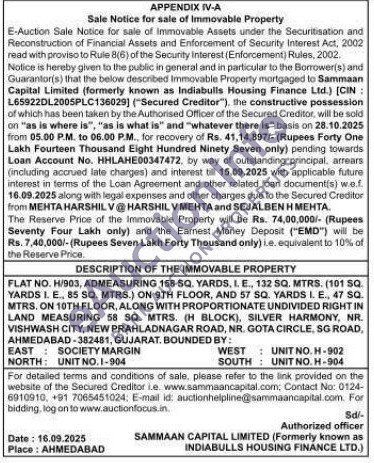 FLAT NO. H/903, ADMEASURING 158 SQ. YARDS. I. E., 132 SQ. MTRS. (101 SQ. YARDS I. E, 85 SQ. MTRS.) ON 9TH FLOOR, AND 57 SQ. YARDS L. E., 47 SQ. MTRS. ON 10TH FLOOR, ALONG WITH PROPORTIONATE UNDIVIDED RIGHT IN LAND MEASURING 58 SQ. MTRS. (H BLOCK), SILVER HARMONY, NR. VISHWASH CITY, NEW PRAHLADNAGAR ROAD, NR. GOTA CIRCLE, SG ROAD, AHMEDABAD-382481, GUJARAT. BOUNDED BY: EAST SOCIETY MARGIN NORTH: UNIT NO.1-904 WEST UNIT NO. H-902 SOUTH UNIT NO. H-904