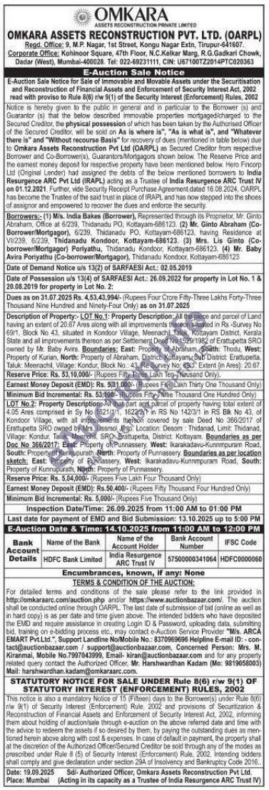 LOT No.1: Property Description: All the piece and parcel of Land having an extent of 20.67 Ares along with all improvements thereon situated in Rs -Survey No 69/1, Block No 43, situated in Kondoor Vilage, Meenachil Taluk, Kottayam District, Kerala State and all improvements thereon as per Settlement Deed No 1529/1982 of Erattupetta SRO owned by Mr. Baby Avira. Boundaries: East: Property of Abraham, South: Thodu, West: Property of Kurian, North: Property of Abraham, District: Kottayam, Sub District: Erattupetta, Taluk: Meenachil, Village: Kondur, Block No: 43, Re Survey No: 69/1. Extent (in Ares): 20.67