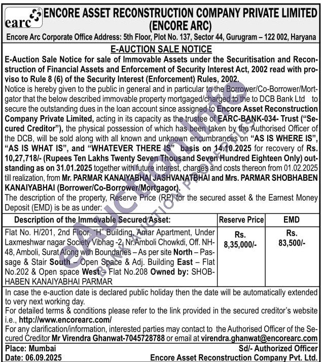 Description of the Immovable Secured Asset: : Flat No. H/201, 2nd Floor, "H" Building, Amar Apartment, Under Laxmeshwar nagar Society Vibhag -2, Nr.Amboli Chowkdi, Off. NH-48, Amboli, Surat Along with Boundaries - As per site North - Pas-sage & Stair South Open Space & Adj. Building East - Flat No.202 & Open space West - Flat No.208 Owned by: SHOB-HABEN KANAIYABHAI PARMAR