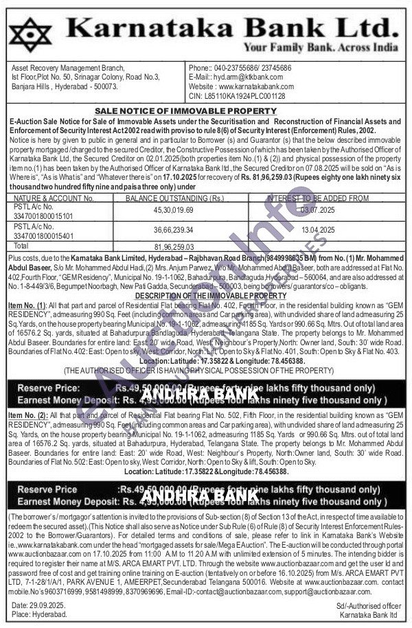 Item No. (2): All that part and parcel of Residential Flat bearing Flat No. 502, Fifth Floor, in the residential building known as "GEM RESIDENCY", admeasuring 990 Sq. Feet (including common areas and Car parking area), with undivided share of land admeasuring 25 Sq. Yards, on the house property bearing Municipal No. 19-1-1062, admeasuring 1185 Sq. Yards or 990.66 Sq. Mtrs. out of total land area of 16576.2 Sq. yards, situated at Bahadurpura, Hyderabad, Telangana State. The property belongs to Mr. Mohammed Abdul Baseer. Boundaries for entire land: East: 20' wide Road, West: Neighbour's Property, North: Owner land, South: 30' wide Road. Boundaries of Flat No. 502: East: Open to sky, West: Corridor, North: Open to Sky & lift, South: Open to Sky. Location: Latitude: 17.35822 &Longitude: 78.456388.