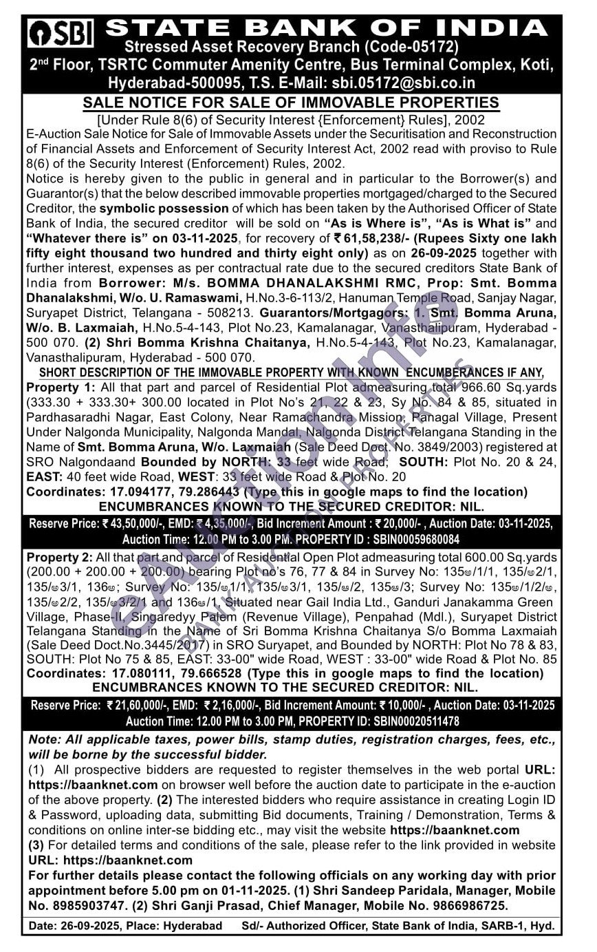 Property 1: All that part and parcel of Residential Plot admeasuring total 966.60 Sq.yards (333.30 333.30+ 300.00 located in Plot No's 21, 22 & 23, Sy No. 84 & 85, situated in Pardhasaradhi Nagar, East Colony, Near Ramachandra Mission, Panagal Village, Present Under Nalgonda Municipality, Nalgonda Mandal, Nalgonda District Telangana Standing in the Name of Smt. Bomma Aruna, W/o. Laxmaiah (Sale Deed Doct. No. 3849/2003) registered at SRO Nalgondaand Bounded by NORTH: 33 feet wide Road; SOUTH: Plot No. 20 & 24, EAST: 40 feet wide Road, WEST: 33 feet wide Road & Plot No. 20