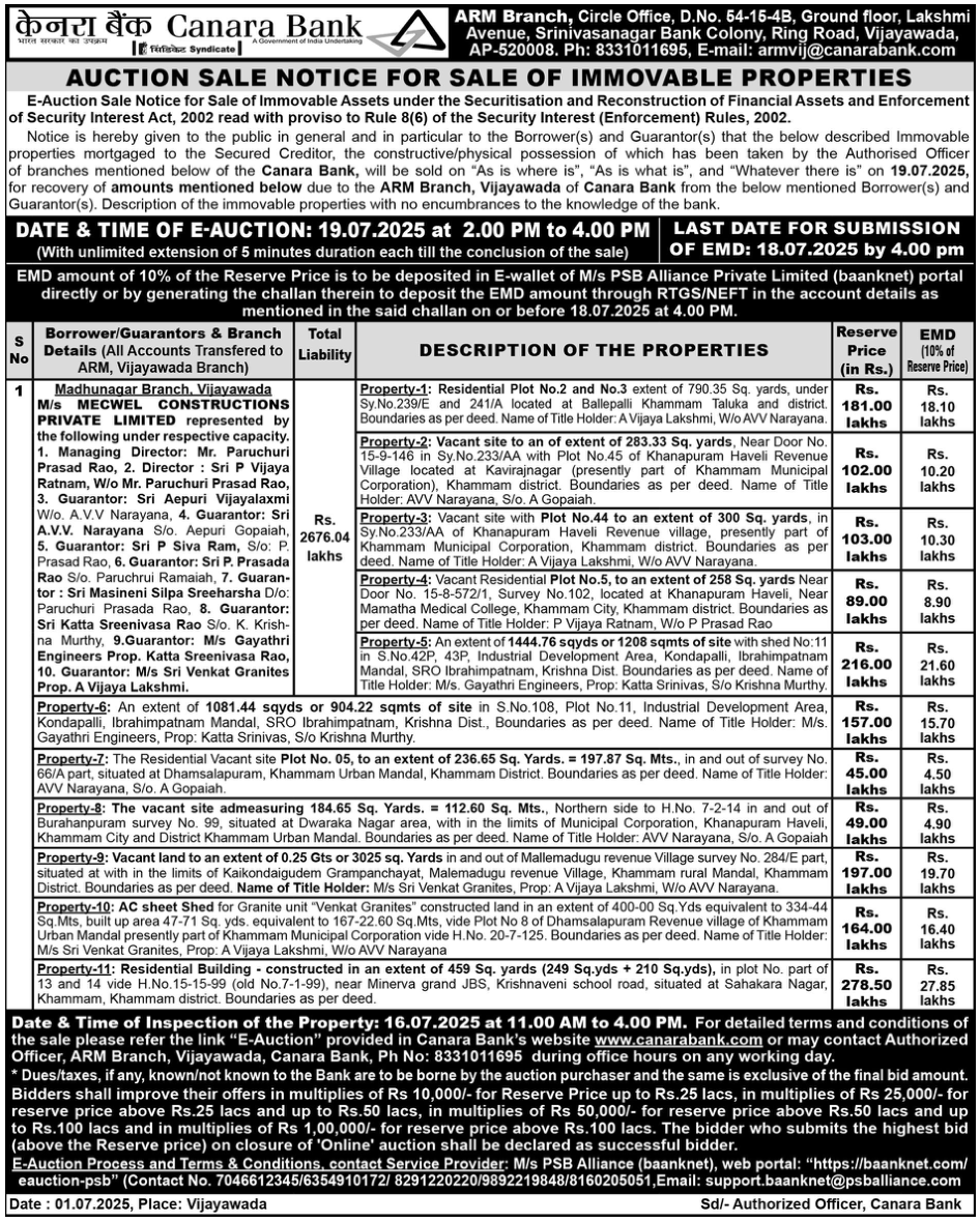 Property-9: Vacant land to an extent of 0.25 Gts or 3025 sq. Yards in and out of Mallemadugu revenue Village survey No. 284/E part, situated at with in the limits of Kaikondaigudem Grampanchayat, Malemadugu revenue Village, Khammam rural Mandal, Khammam District. Boundaries as per deed. Name of Title Holder: M/s Sri Venkat Granites, Prop: A Vijaya Lakshmi, W/o AVV Narayana