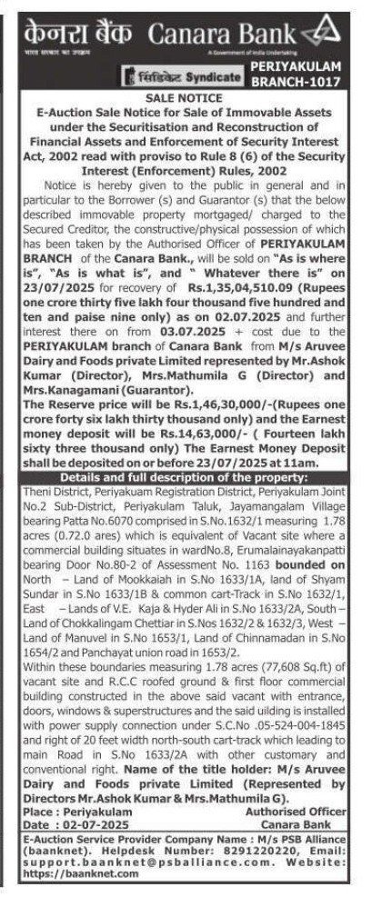 Theni District, Periyakuam Registration District, Periyakulam Joint No.2 Sub-District, Periyakulam Taluk, Jayamangalam Village bearing Patta No.6070 comprised in S.No. 1632/1 measuring 1.78 acres (0.72.0 ares) which is equivalent of Vacant site where a commercial building situates in wardNo.8, Erumalainayakanpatti bearing Door No.80-2 of Assessment No. 1163 bounded on North Land of Mookkaiah in S.No 1633/1A, land of Shyam Sundar in S.No 1633/18 & common cart-Track in S.No 1632/1, East Lands of V.E. Kaja & Hyder Ali in S.No 1633/2A, South-Land of Chokkalingam Chettiar in S.Nos 1632/2 & 1632/3, West Land of Manuvel in S.No 1653/1, Land of Chinnamadan in S.No 1654/2 and Panchayat union road in 1653/2.