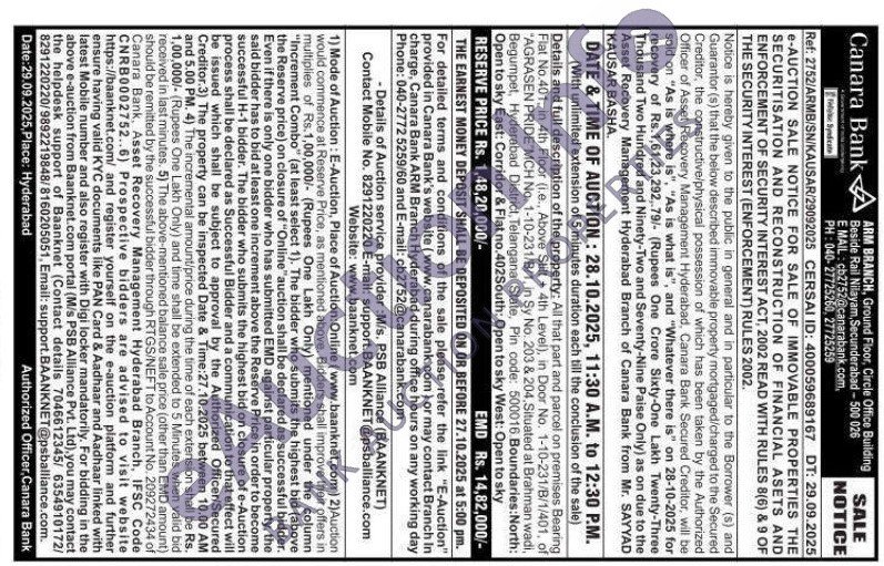 Details and full description of the property: All that part and parcel on premises Bearing Flat No.401, in 4th Floor (i.e., Above Stilt + 4th Level), in Door No. 1-10-231/B/1/401, of "AGRASEN PRIDE MCH No. 1-10-231/B/1, in Sy No. 203 & 204, Situated at Brahman wadi,