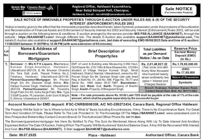 EMT of Land & Building area Measuring 0.094 Hect. Old Khasra No. 210/1 Min & New Khasara No. 210 Min situated at Village Haripur Kunwar Singh, Tehsil Haldwani, District Nainital, Uttarakhand, owned by Mr. Pooran Singh S/o Mr. Deewan Singh vide sale deed Reg. in Bahi No. 01, Jild No. 596, Page No. 76-77 and Serial No. 1894 dated 09.07.1987.