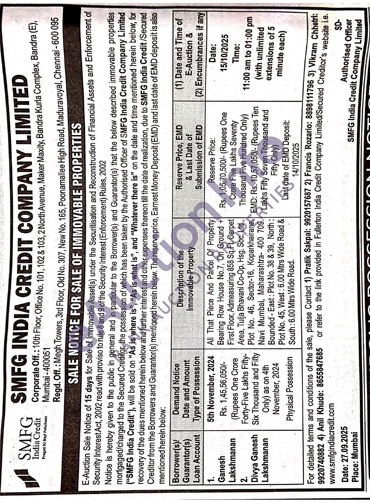 All That Piece And Parcel Of Property Bearing Row House No.7, On Ground + First Floor, Admeasuring 858 Sq. Ft. Carpet Area, Tulja Bhavani Co-Op. Hsg. Soc. Ltd., Plot No. 46, Sector-16, Koparkhairane, Navi Mumbai, Maharashtra- 400 709. Bounded - East: Plot No. 38 & 39, North: Plot No. 45, West: 6.00 Mtrs Wide Road & South: 6.00 Mtrs Wide Road.