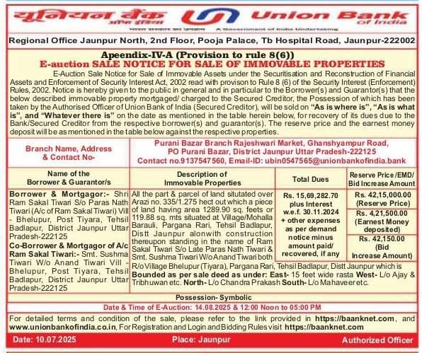 All the part & parcel of land situtated over Arazi no. 335/1.275 hect out which a piece of land having area 1289.90 sq. feets or 119.88 sq. mts situated at Village/Mohalla Barauli, Pargana Rari, Tehsil Badlapur, Distt Jaunpur alonwith construction thereupon standing in the name of Ram Sakal Tiwari S/o Late Paras Nath Tiwari & Smt. Sushma Tiwari W/o Anand Tiwari both R/o Village Bhelupur (Tiyara), Pargana Rari, Tehsil Badlapur, Distt Jaunpur