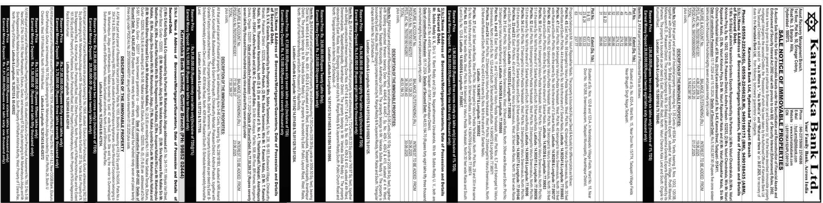 No. 2.All that part and parcel of Residential Plots as follows: Situated at Sy. No. 620-A, Ward No. 15, Near Door No.15/774, Tadapatri Village Fields Near Bhagath Singh Nagar, Tadapatri. Plot No. Extent (Sq. Yds) 45 286.66 47 286.66 49 274.72 50 274.72 52 286.66 54 286.66 22 & 23 573.33 31 286.66 Plot No. Extent (Sq. Yds) 9 & 10 437.33 Situated at Sy. Nos. 122-B and 123-A, in Nandalapadu Village Fields, Ward No. 16, Near Door No. 16/1268, Sreenivasapuram, Tadapatri Municipality, Ananthapur District. 23 & 24 533.33 37 350.69 63 237.77 Property belongs to Mr. Veluri Rajasekhar Naidu. The property is bounded (As per Deed & Actuals) for different plots as follows: Plot No. 45: East: Plot No. 66 belonged to Veluru Pedda Yerikalaiah, West: Plot No. 42 belonged to Veluru Sreenivasulu, North: 30 feet wide Rasta and South: Plot No. 44 in the same Sy. No. fell to the share of V. Sankar Naidu. Latitude: 14.902541 & Longitude: 77.990663 Plot No. 47: East: Plot No. 64 belonged to Veluru Pedda Yerikalaiah, West: Plot No. 40 belonged to Veluru Sreenivasulu, North: 30 feet wide Rasta and South: Plot No. 46 in the same Sy. No. fell to the share of V. Sankar Naidu. Latitude: 14.90298 & Longitude: 77.990727 Plot No. 49: East: Plot No. 62 belonged to Veluru Pedda Yerikalaiah, West: Plot No. 38 belonged to Veluru Sreenivasulu, North: 30 feet wide Rasta and South: Plot No. 48 in the Sy. No. fell to the share of V. Sankar Naidu. Latitude: 14.90338 & Longitude: 77.99083 Plot No. 50: East: Plot No. 61 belonged to Veluru Pedda Yerikalaiah, West: Plot No. 37 belonged to Veluru Sreenivasulu, North: Plot No. 51 in the same Sy. No. fell to the share of V. Sankar Naidu and South: 30 feet wide Rasta. Latitude: 14.903611 & Longitude: 77.990856 Plot No. 52: East: Plot No. 59 belonged to Veluru Pedda Yerikalaiah, West: Plot No. 35 belonged to Veluru Sreenivasulu, North: Plot No. 53 in the same Sy. No. fell to the share of V. Sankar Naidu and South: 30 feet wide Rasta. Latitude: 14.90405 & Longitude: 77.99096 Plot No. 54: East: Plot No. 57 belonged to Veluru Pedda Yerikalaiah, West: Plot No. 33 belonged to Veluru Sreenivasulu, North: Plot No. 55 in the same Sy. No. fell to the share of V. Sankar Naidu and South: 30 feet wide Rasta. Latitude: 14.904377 & Longitude: 77.991046 Plot Nos. 22 and 23: East: Plot Nos. 40 and 41 belonged to Veluru Sreenivasulu, West: 30 feet wide Rasta, North: 30 feet wide Rasta and South: 30 feet wide Rasta. Latitude: 14.903033 & Longitude:77.990526 Plot No. 31: East: Plot No. 32 belonged to Veluru Sreenivasulu, West: 30 feet wide Rasta, North: 30feet wide Rasta and South: Plot No. 30 belonged to Veluru Venkata Ramana. Latitude: 14.904556 & Longitude: 77.990866 Plot Nos. 9 and 10: East: Plot Nos. 11 and 12 belonged to Veluru Pedda Yerikalaiah, West. Plot Nos. 6,7 and 8 belonged to Veluru Sreenivasulu, North: Land in Sy. No. 122-Aand South: 30 feet wide Rasta. Latitude: 14.904872 & Longitude: 77.98971 Plot Nos. 23 and 24: East: Plot No. 22 belonged to Veluru Pedda Yerikalaiah, West: Plot No. 25 belonged to Veluru Sreenivasulu, North: 30 feet wide Rasta and South: Plot Nos. 42 and 43 in the same Sy. Nos. fell to the share of V. Sankar Naidu. Latitude: 14.904677 & Longitude: 77.989582 Plot No. 37: East: 30 feet wide Rasta, West: Plot No. 36 belonged to Veluru Pedda Yerikalaiah, North: Plot Nos. 29 and 30 in the same Nos. fell to the share of V. Sankar Naidu and South: 30 feet wide Rasta. Latitude: 14.904709 & Longitude: 77.98874 Sy. Plot No. 63: East: 30 feet wide Rasta, West: Plot No. 64 belonged to Veluru Pedda Yerikalaiah, North:30 feet wide Rasta and South: Land in Sy. No. 123-B. Latitude: 14.904509 & Longitude: 77.988667.