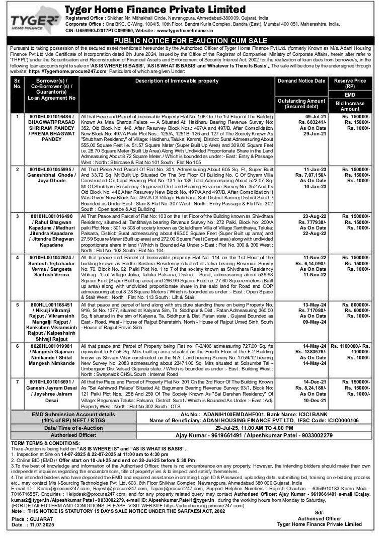 4) All that peace and Parcel of Immovable property Flat No. 114 on the 1st Floor of the building known as Radhe Krishna Residency situated at Jolva bearing Revenue Survey No. 70, Block No. 92, Paiki Plot No. 1 to 7 of the society known as Shivdhara Residency Vibhag -1, of Village Jolva, Taluka Palsana, District Surat, admeasuring about 539.98 Square Feet (Super Built up area) and 296.99 Square Feeti.e. 27.60 Square meters (Built up area) along with undivided proportionate share in the said land for Road and COP admeasuring about 8.28 Square Meters/Which is bounded as under:- East: Open Space & Stair West: North Flat No. 113 South: Lift & Stair