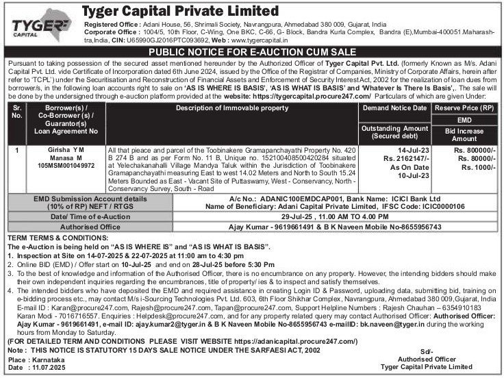 All that pieace and parcel of the Toobinakere Gramapanchayathi Property No. 420 B 274 B and as per Form No. 11 B. Unique no. 152100408500420284 situated at Yelechakanahalli Village Mandya Taluk within the Jurisdiction of Toobinakere Gramapanchayathi measuring East to west 14.02 Meters and North to South 15.24 Meters Bounded as East - Vacant Site of Puttaswamy, West-Conservancy, North -Conservancy Survey, South - Road