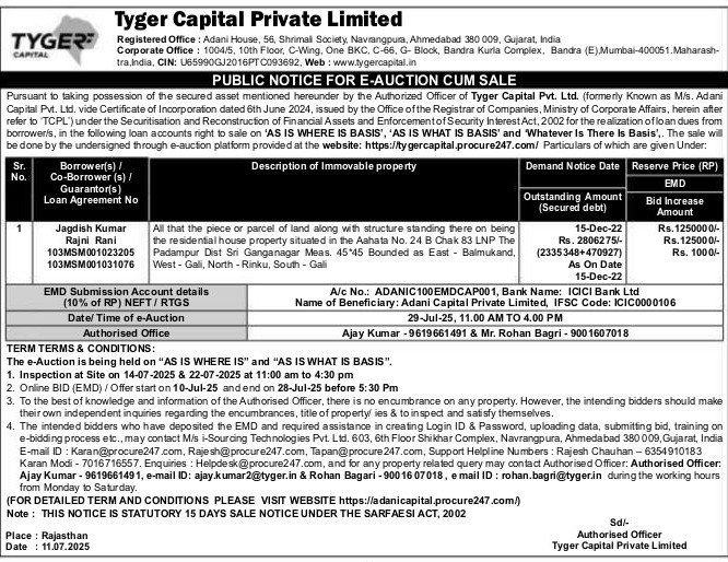 All that the piece or parcel of land along with structure standing there on being the residential house property situated in the Aahata No. 24 B Chak 83 LNP The Padampur Dist Sri Ganganagar Meas. 45°45 Bounded as East Balmukand. West-Gali, North-Rinku, South - Gali